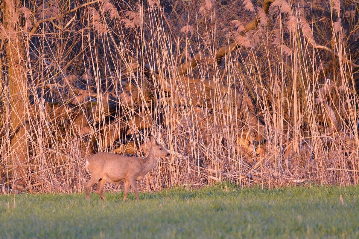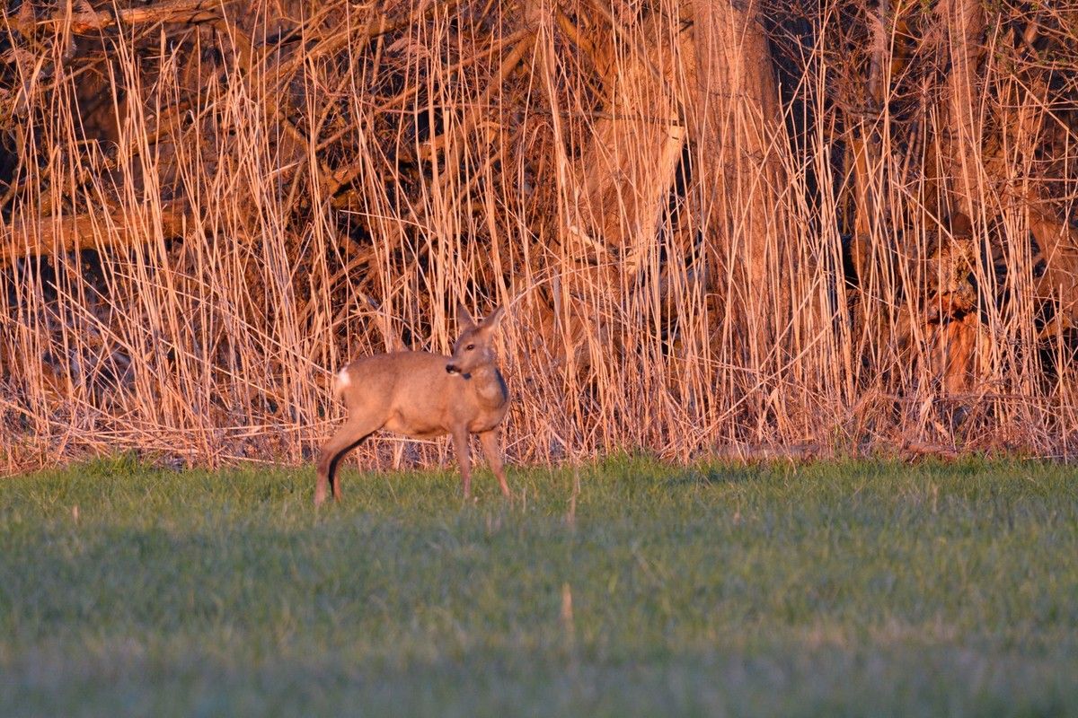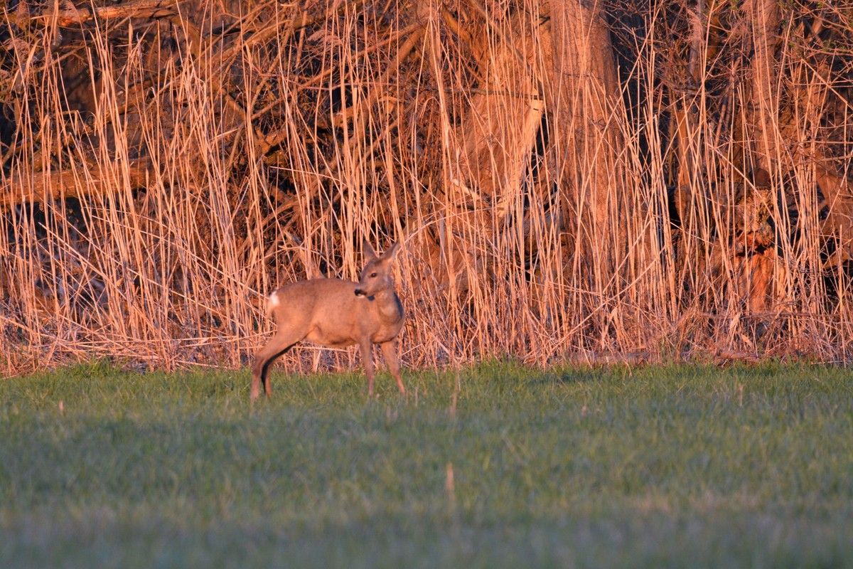 Entre un lever du jour qui éclaire favorablement quelques colverts, des rayons qui brille largement sur un héron qui se promène tranquillement et une chevrette pleine qui profite en du soleil couchant pour sortir d'un bosquet pour s'alimenter, c'est que du bonheur.